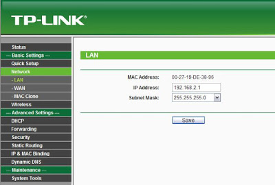 - Masukkan username : admin dan password : admin maka akan muncul interface dari Wireless Router TP-Link. (perlu diketahui bahwa wireless router ini kita akan hubungkan dengan modem ADSL, pada umumnya IP Address default dari modem adalah 192.168.1.1 sehingga kita harus mengganti IP Address yang berada di wireless router yang akan kita setting lebih lanjut, untuk mudahnya kita beri saja alamat wireless router menjadi 192.168.2.1 dan alamat komputer/laptop kita ubah menkadi 192.168.2.2 supaya kita dapat melanjutkan settingan terhadap wireless router). Pilih menu Network> LAN isikan alamat seperti diatas kemudian Subnet Mask : 255.255.255.0